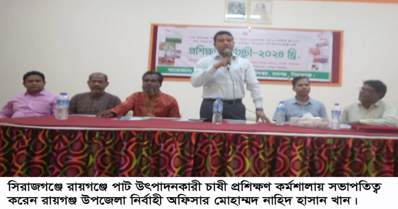 সোমবার (১০ জুন) সকাল ১০টায় বস্ত্র ও পাট মন্ত্রনালয়ের অধীন পাট অধিদপ্তর কর্তৃক বাস্তবায়নাধীন ও উপজেলা প্রশাসনের আয়োজনে উন্নত প্রযুক্তি নির্ভর পাট ও পাটবীজ উৎপাদন এবং সম্প্রসারণ (১ম সংশোধিত) প্রকল্পের উদ্যোগে উপজেলা পরিষদ মিলনায়তনে এ প্রশিক্ষণ অনুষ্ঠিত হয়। প্রশিক্ষণ কর্মশালায় সভাপতিত্ব করেন রায়গঞ্জ উপজেলা নির্বাহী অফিসার মোহাম্মদ নাহিদ হাসান খান। অনুষ্ঠিত প্রশিক্ষণে উপজেলার ১ পৌর সভা ও ৯টি ইউনিয়নের পাট ও বীজ উৎপাদনকারী ৭৫ জন পাট চাষী কৃষক-কৃষাণী অংশগ্রহণ করেন। এসময় প্রশিক্ষণ প্রদান করেন সিরাজগঞ্জের বিএডিসি’র সিনিয়র সহকারী পরিচালক মো. শফিকুল ইসলাম, উপজেলার অতিরিক্ত কৃষি অফিসার দেলোয়ার হোসাইন, জেলা পাট উন্নয়ন কর্মকর্তা মো. নাজমুল হক, রায়গঞ্জ উপ-সহকারী পাঠ উন্নয়ন কর্মকর্তা হেলাল উদ্দিন।