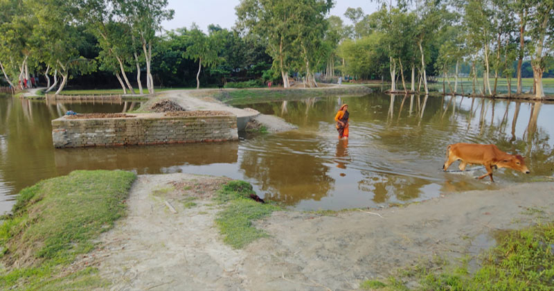 সরেজমিনে দেখা যায়, হাতিয়া ভবেশ বগাপাড়া এলাকায় নতুন ব্রিজ নির্মাণের জন্য প্রায় ২২ বছর আগের পুরনো একটি কালভার্ট ভেঙে ফেলা হয়। সেখানে ৮-১০ ফুট গর্ত করা হয়। কালভার্ট ভেঙে ফেলা হলেও মানুষের চলাচলে কোনো সংযোগ সড়ক করা হয়নি। স্থানীয়দের উদ্যোগে অন্যের জমি দিয়ে রাস্তা তৈরি করা হয়। কিন্তু বর্ষা মৌসুমে কোমড় সমান পানি হওয়ায় দুর্ভোগের শিকার হচ্ছেন পথচারীরা।