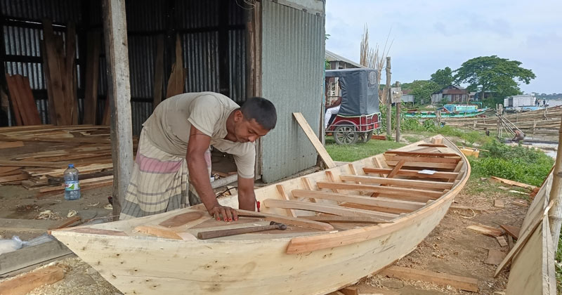 ছবির ক্যাপশন: মতলব উত্তর উপজেলার সটাকী বাজারে নতুন নৌকা তৈরি করছেন কাঠমিস্ত্রি সুমন প্রধান।