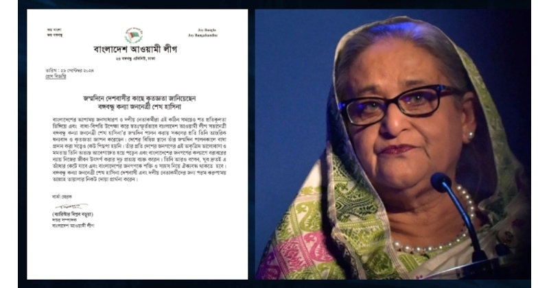 বিবৃতিতে বলা হয়, শেখ হাসিনা দেশের আপামর জনসাধারণ এবং আওয়ামী লীগ নেতাকর্মীদের শত প্রতিকূলতা সত্ত্বেও স্বতঃস্ফূর্তভাবে তার জন্মদিন উদযাপনের জন্য আন্তরিক ধন্যবাদ ও কৃতজ্ঞতা জানিয়েছেন। তিনি বলেন, বিভিন্ন স্থানে তার জন্মদিন পালনকালে বাধা প্রদান করা হলেও কেউ পিছপা হয়নি এবং সবাই উদ্যমের সঙ্গে তা পালন করেছে।