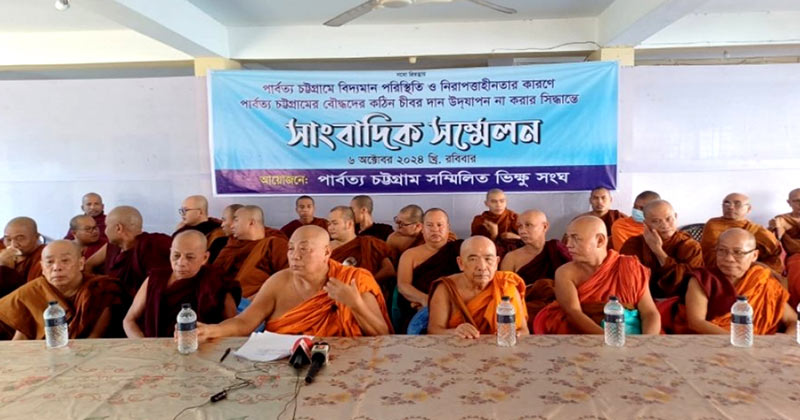 ভদন্ত মহাথের বলেন, এরকম চরম অনিশ্চয়তা ও নিরাপত্তাহীন পরিবেশে পার্বত্য চট্টগ্রামের বৌদ্ধ সমাজ ও ভিক্ষু সংঘ আসন্ন পবিত্র ধর্মীয় উৎসব কঠিন চীবর দান অনুষ্ঠান আয়োজনের বিষয়ে কোনও উৎসাহ বোধ না করায় সার্বিক পরিস্থিতি বিবেচনায় নিয়ে শ্রদ্ধাবান দায়িক-দায়িকা ও পূজনীয় ভিক্ষু সংঘের মধ্যে আলোচনাক্রমে চলতি বছরের কঠিন চীবর দান অনুষ্ঠান না করার সর্বসম্মত সিদ্ধান্ত নিতে বাধ্য হয়েছি।