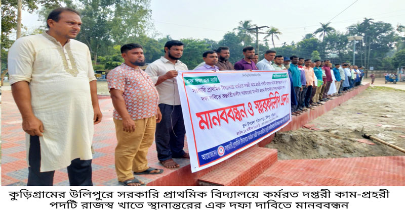 “এক দফা এক দাবি, জাতীয়করণ ন্যায্য দাবি” এই প্রতিপাদ্যকে ধারন করে কুড়িগ্রামের উলিপুরে সরকারি প্রাথমিক বিদ্যালয়ে কর্মরত দপ্তরী কাম-প্রহরী পদটি রাজস্ব খাতে স্থানান্তরের এক দফা দাবিতে মানববন্ধন ও ইউএনও’র মাধ্যমে প্রধান উপদেষ্টা বরাবর স্মারকলিপি প্রদান করা হয়েছে।