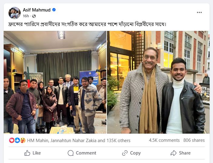 এদিকে, ফেসবুকে দুইটি ছবি পোস্ট করে আসিফ মাহমুদ লিখেছেন, ‘ফ্রান্সের প্যারিসে প্রবাসীদের সংগঠিত করে আমাদের পাশে দাঁড়ানো বিপ্লবীদের সাথে।’