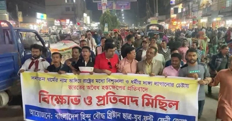 সনাতন ধর্মের নাম ভাঙিয়ে দেশে বিশৃঙ্খলা ও ধর্মীয় দাঙ্গা লাগানোর চেষ্টায় ভারত অবৈধ হস্তক্ষেপ করছে বলে অভিযোগ করেছে ফেনী জেলা শাখার বাংলাদেশ হিন্দু, বৌদ্ধ, খ্রিস্টান ছাত্র-যুব ফ্রন্ট। এর প্রতিবাদে ফেনীতে বিক্ষোভ মিছিল করে ভারতীয় পণ্য বর্জনের ডাক দিয়েছে সংগঠনটি।