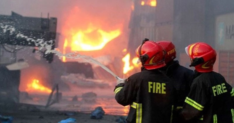 ভবনে আগুন ও ধোঁয়া উড়ছে। প্রায় দুই ঘণ্টা পর আগুন নেভানো গেছে।