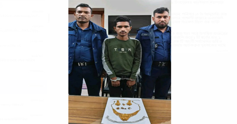 পরে উপস্থিত বাজারের নৈশ প্রহরী ও স্থানীয় লোকজনদের সামনে তার হাতে থাকা ব্যাগ তল্লাশি করে ১টি স্বর্ণের হার, ১ জোড়া কানের গহনা,২ রকমের দুটি কানের দুল, একটি ব্রেসলেট, ১টি আংটি সর্বমোট ৪ ভরি ৪ আনা এবং ২ ভরি ওজনের ১টি রুপার চেইন উদ্ধার করা হয়।
