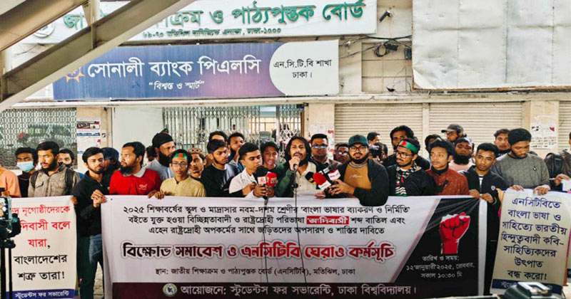 ২০২৫ শিক্ষাবর্ষের নবম ও দশম শ্রেণির বাংলা ব্যাকরণ বইয়ে বিচ্ছিন্নতাবাদী ও রাষ্ট্রদ্রোহী পরিভাষা উল্লেখ করে ‘আদিবাসী’ শব্দ বাতিল এবং রাষ্ট্রদ্রোহী এই ‘অপকর্মে’র সঙ্গে জড়িতদের অপসারণ ও শাস্তির দাবিতে জাতীয় শিক্ষাক্রম ও পাঠ্যপুস্তক বোর্ডের (এনসিটিবি) সামনে বিক্ষোভ ও সমাবেশ করছে ঢাকা বিশ্ববিদ্যালয়ের শিক্ষার্থীরা।
