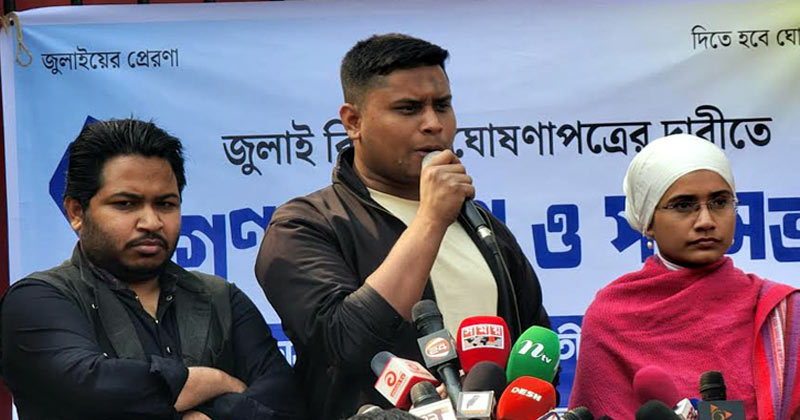 মঙ্গলবার (১৪ জানুয়ারি) নারায়ণগঞ্জের কেন্দ্রীয় শহীদ মিনারে বৈষম্যবিরোধী ছাত্র আন্দোলন ও জাতীয় নাগরিক কমিটির উদ্যোগে জুলাই বিপ্লবের ঘোষণাপত্রের প্রচারণা ও লিফলেট বিতরণের সময় সংক্ষিপ্ত সমাবেশে তিনি এ কথা বলেন।
