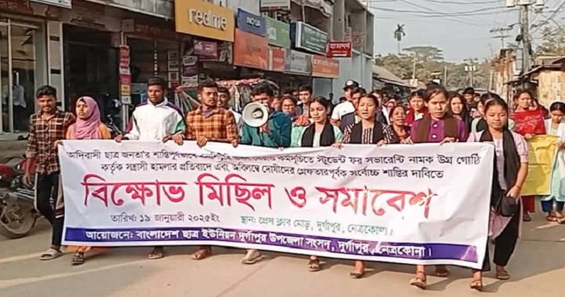 এনসিটিবি কর্তৃক বাংলা দ্বিতীয় পত্র বইয়ের পেছনের প্রচ্ছদ থেকে আদিবাসী শব্দ সম্বলিত গ্রাফিতি বাতিল করার প্রতিবাদে ‘ আদিবাসী ছাত্র জনতা’ আহুত বিক্ষোভ সমাবেশে প্রতিক্রিয়াশীল সন্ত্রাসী সংগঠন ‘স্টুডেন্ট ফর সভেরেন্টি’ এর নৃশংস সন্ত্রাসীর হামলার প্রতিবাদে এবং হামলায় জড়িত সন্ত্রাসীদের গ্রেফতার ও বিচারের দাবিতে নেত্রকোণার দুর্গাপুরে বাংলাদেশ ছাত্র ইউনিয়ন দুর্গাপুর উপজেলা সংসদের উদ্যোগে প্রতিবাদ সমাবেশ ও বিক্ষোভ মিছিল করা হয়।