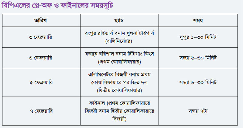 টেবিলের শীর্ষে থেকে প্লে-অফে উঠেছে গত আসরের চ্যাম্পিয়ন ফরচুন বরিশাল। এ ছাড়া যথাক্রমে চিটাগাং কিংস, রংপুর রাইডার্স ও খুলনা টাইগার্সের শেষ চার নিশ্চিত হয়েছে।