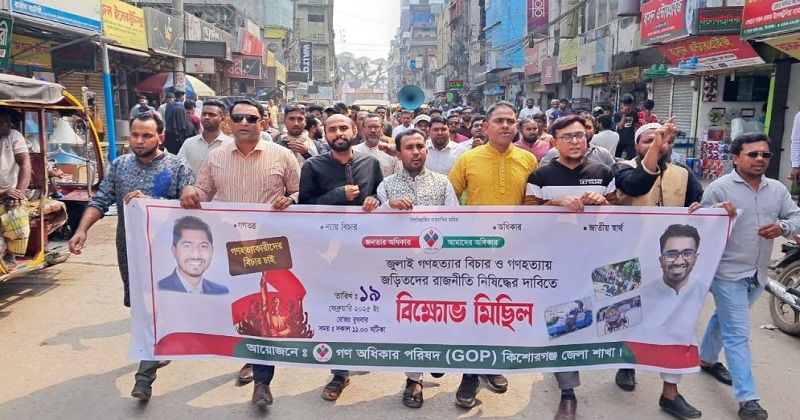জুলাই গণহত্যার বিচার ও গণহত্যায় জড়িতদের রাজনীতি নিষিদ্ধের দাবিতে বিক্ষোভ মিছিল করেছে গণঅধিকার পরিষদ কিশোরগঞ্জ জেলা।