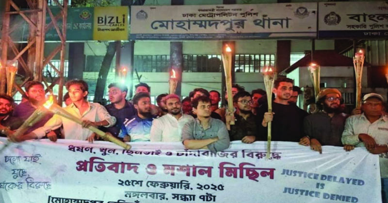 রাজধানীর মোহাম্মদপুর এলাকায় গত কয়েকদিন ধরে ছিনতাই ও কিশোর গ্যাংয়ের তাণ্ডব বেড়ে যাওয়ায় স্থানীয়রা উদ্বেগ প্রকাশ করেছেন। এ পরিস্থিতির প্রতিবাদ হিসেবে মোহাম্মদপুর থানার সামনে মশাল মিছিল ও বিক্ষোভ করেছে স্থানীয় ছাত্র-জনতা।