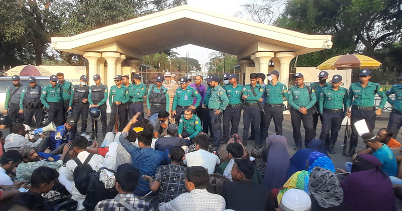 বুধবার (২৬ ফেব্রুয়ারি) বেলা ১১টা ৪৫ মিনিটের দিকে মিছিল নিয়ে এসে কার্যালয়ের সামনে বসে পড়েন তারা।