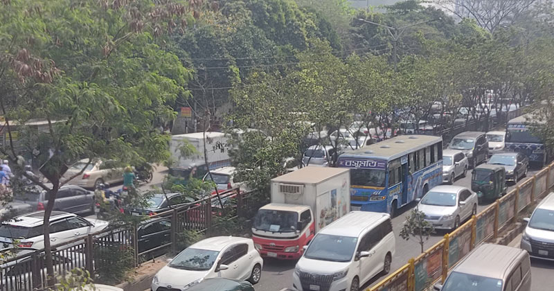 সোমবার (১০ মার্চ) বেলা সাড়ে ১১টার দিকে রাজধানীর ইসিবি চত্বর, মাটিকাটা থেকে ফ্লাইওভার হয়ে রেডিসন ব্লু হোটেল পর্যন্ত সড়কে দেখা গেছে, পুরো সড়কেই গাড়ির তীব্র চাপ।