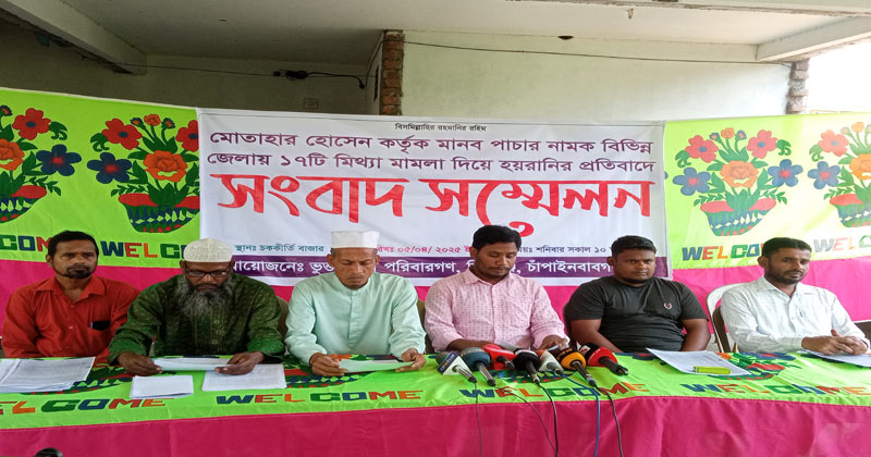 এ সময় লিখিত বক্তব্যে পাঠ করের মোঃ কামাল উদ্দিন। তিনি বলেন, উপজেলার চককীর্তি ইউনিয়নের গৌরিসংকরপুর এলাকার এন্তাজ আলীর ছেলে মোতাহার হোসেনের সঙ্গে পরিচিতির সুবাদে বিদেশ থেকে আর্থিক সহায়তার দেবার প্রলোভন দেখিয়ে ২০২২ সালে আমার ব্যাংক একাউন্ট নম্বর চায়। একইভাবে তিনিসহ গ্রামের ৮ অসহায় ব্যক্তির ব্যাংক একাউন্ট নম্বর নিয়ে চেক সংগ্রহ করেন মোতাহার হোসেন। পরে ২০২৩ সালের এপ্রিল পর্যন্ত ৮টি একাউন্টে প্রায় ১০ কোটি টাকা লেনদেন করেন তিনি। এরপর চাঁপাইনবাবগঞ্জ জেলাসহ বিভিন্ন জেলায় এই ৮ জনের বিরুদ্ধে ১৭টি মামলা করান মোতাহার হোসেন।