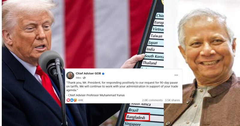 বৃহস্পতিবার (১০ এপ্রিল) রাতে নিজের অফিসিয়াল ফেসবুক পেজে প্রধান উপদেষ্টা লিখেছেন, “শুল্ক কার্যকর ৯০ দিন স্থগিত করার আমাদের অনুরোধে ইতিবাচক সাড়া দেওয়ায় আপনাকে ধন্যবাদ মিস্টার প্রেসিডেন্ট। আপনার বাণিজ্য এজেন্ডাকে সহায়তা করতে আমরা আপনার প্রশাসনের সঙ্গে কাজ অব্যাহত রাখব।”