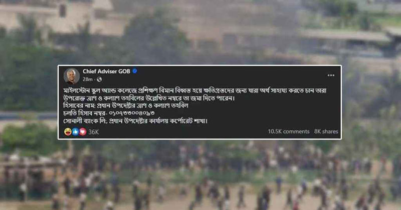 দুপুর ২টার দিকে প্রধান উপদেষ্টার ভেরিফায়েড ফেসবুক পেজ থেকে পোস্টটি করা হয়। সেখানে লেখা ছিল, মাইলস্টোন স্কুল অ্যান্ড কলেজে প্রশিক্ষণ বিমান বিধ্বস্ত হয়ে ক্ষতিগ্রস্তদের জন্য যারা অর্থ সাহায্য করতে চান, তারা উপরোক্ত ত্রাণ ও কল্যাণ তহবিলের উল্লেখিত নম্বরে তা জমা দিতে পারেন। হিসাবের নাম: প্রধান উপদেষ্টার ত্রাণ ও কল্যাণ তহবিল, চলতি হিসাব নম্বর-০১০৭৩৩০০৪০৯৩, সোনালী ব্যাংক লি., প্রধান উপদেষ্টার কার্যালয় করপোরেট শাখা।