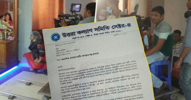 রাজধানীর উত্তরার চার নম্বর সেক্টরের একটি বাড়িতে দীর্ঘদিন ধরে জনপ্রিয় অভিনয় শিল্পীদের নাটক ও সিনেমার শুটিং হয়ে আসছে। হঠাৎ করে ওই বাড়িতে শুটিং বন্ধের নির্দেশ দিয়েছে উত্তরা চার নম্বর সেক্টরের আবাসিক এলাকা কল্যাণ সমিতি। এমন নির্দেশের তীব্র নিন্দা জানিয়েছে অভিনয় শিল্পী সংঘের সাধারণ সম্পাদক রাশেদ মামুন অপু।