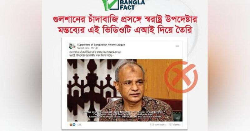 বাংলাফ্যাক্ট আরও জানায়, গুলশানের চাঁদাবাজি প্রসঙ্গে স্বরাষ্ট্র উপদেষ্টার মন্তব্যের যে ভিডিওটি ছড়ানো হয়েছে, সেটি এআই দিয়ে তৈরি।