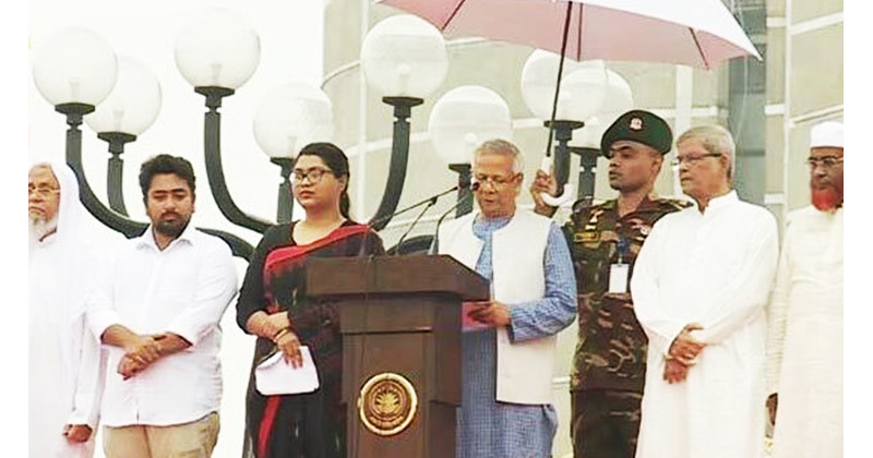 প্রধান উপদেষ্টা ‘জুলাই ঘোষণাপত্র’ পাঠে বলেন, যেহেতু উপনিবেশবিরোধী লড়াইয়ের সুদীর্ঘকালের ধারাবাহিকতায় এই ভূখণ্ডের মানুষ দীর্ঘ ২৩ বছর পাকিস্তানের স্বৈরশাসকদের বঞ্চনা ও শোষণের বিরুদ্ধে রুখে দাঁড়িয়েছিল এবং নির্বিচার গণহত্যার বিরুদ্ধে গণপ্রতিরোধ গড়ে ১৯৭১ সালের ২৬ মার্চ স্বাধীনতা ঘোষণা করে জাতীয় মুক্তির লক্ষ্যে রক্তক্ষয়ী মুক্তিযুদ্ধের মাধ্যমে বাংলাদেশ রাষ্ট্র প্রতিষ্ঠা করেছিল; এবং