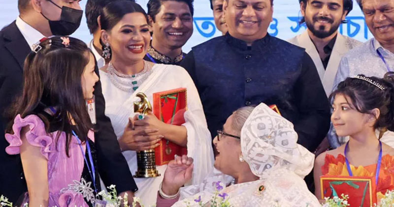 পুরস্কার হাতে দাঁড়িয়ে আছেন অভিনেত্রী আজমেরী হক বাঁধন। তার চোখ-মুখে উচ্ছ্বাসের ঢেউ। তার সামনের চেয়ারে বসা প্রাক্তন প্রধানমন্ত্রী শেখ হাসিনা বাঁধনের দিকে ফিরে হাসছেন। বাঁধনের পাশে শোবিজ অঙ্গনের অনেক তারকাই দাঁড়িয়ে আছেন। একটি স্থিরচিত্রে এমন দৃশ্য দেখা যায়।