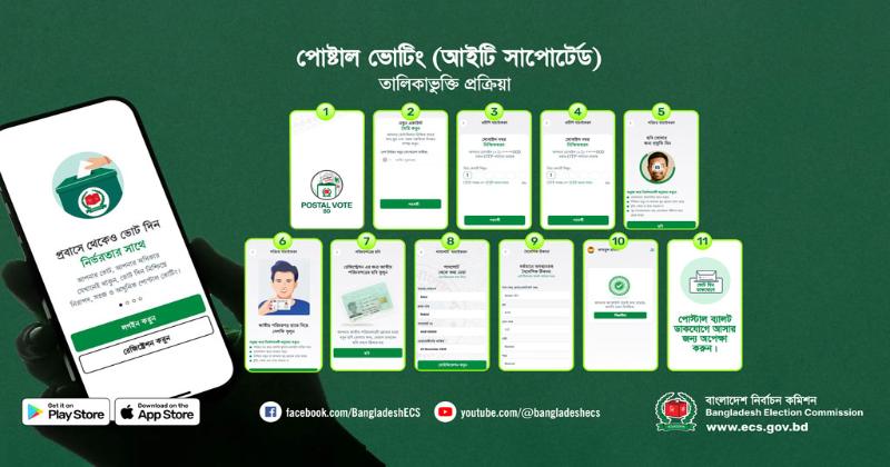 প্রবাসী বাংলাদেশিদের ভোটাধিকার নিশ্চিতে পোস্টাল ব্যালটে (আইটি সাপোর্টেড) ভোটিংয়ের জন্য নিবন্ধন এবং ভোট দেওয়ার প্রক্রিয়া প্রকাশ করেছে নির্বাচন কমিশন (ইসি)। আজ সোমবার ইসির ওয়েবসাইটে এ প্রক্রিয়ার নমুনা প্রকাশ করা হয়। এতে ‘পোস্টাল ভোটিংয়ের (আইটি সাপোর্টেড) তালিকাভুক্তি প্রক্রিয়া এবং পোস্টাল ভোটিংয়ের (আইটি সাপোর্টেড) ভোটদান প্রক্রিয়া’র বিষয় তুলে ধরা হয়।