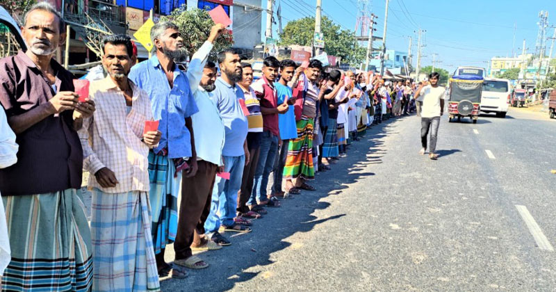 টাঙ্গাইল-৩(ঘাটাইল) আসনে দলীয় মনোনয়ন পরিবর্তনের দাবিতে ‘লাল কার্ড’ হাতে নিয়ে ১৮ কিলোমিটার দীর্ঘ মানববন্ধন কর্মসূচি পালন করেছে বিএনপি নেতাকর্মীরা। মঙ্গলবার(১৮ নভেম্বর) টাঙ্গাইল-ময়মনসিংহ আঞ্চালিক মহাসড়কে ঘাটাইল উপজেলার হামিদপুর বাসস্ট্যান্ড থেকে দেউলাবাড়ি বাসস্ট্যান্ড পর্যন্ত ১৮ কিলোমিটার এলাকায় দেড় ঘণ্টাব্যাপী ওই মানববন্ধন কর্মসূচি পালন করা হয়।