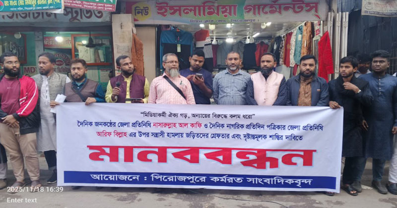 পিরোজপুরে জনকণ্ঠ ও নাগরিক প্রতিদিনের দুই সাংবাদিকের ওপর হামলার প্রতিবাদে মানববন্ধন