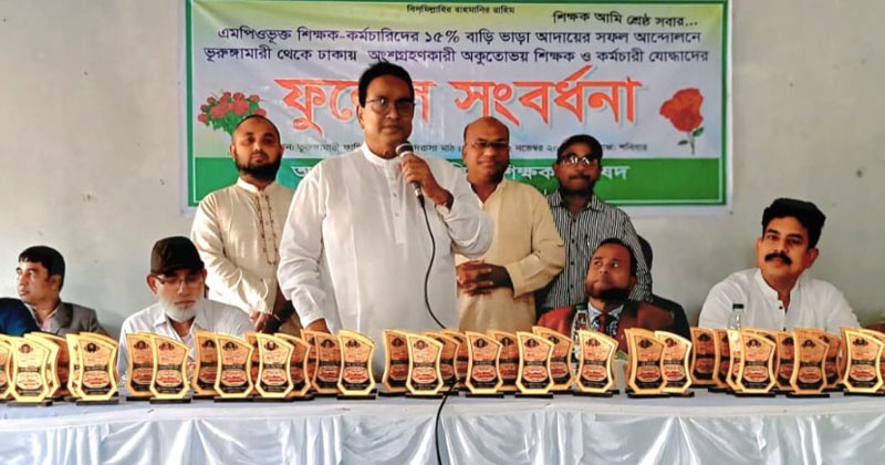 কুড়িগ্রামের ভূরুঙ্গামারীতে এমপিওভূক্ত শিক্ষক-কর্মচারিদের দাবি আদায়ের আন্দোলনে ঢাকায় অংশগ্রহণকারী শিক্ষক ও কর্মচারীদের ফুলেল সংবর্ধনা দেয়া হয়েছে।