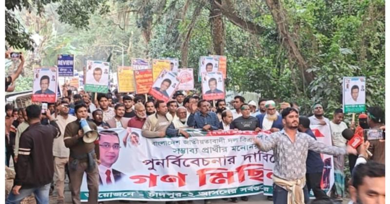 চাঁদপুর-২ (মতলব উত্তর ও দক্ষিণ) নির্বাচনী এলাকায় বিএনপির ঘোষিত সম্ভাব্য প্রার্থীর মনোনয়ন পুনর্বিবেচনার দাবিতে গণমিছিল ও বিক্ষোভ সমাবেশ অনুষ্ঠিত হয়েছে। জেলা বিএনপির যুগ্ম সাধারণ সম্পাদক তানভীর হুদার অনুসারীও তৃণমূল বিএনপি উদ্যোগে রবিবার (২৩ নভেম্বর) বিকেলে এ কর্মসূচি পালিত হয়।