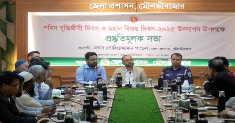 মৌলভীবাজারে আগামী ১৪ ডিসেম্বর শহীদ বুদ্ধিজীবী দিবস ও ১৬ ডিসেম্বর মহান বিজয় দিবস - ২০২৫ উদযাপন উপলক্ষে প্রস্তুতিমূলক সভা অনুষ্ঠিত হয়েছে। মঙ্গলবার (২৫ নভেম্বর) সকাল ১১টায় জেলা প্রশাসনের আয়োজনে এ সভা অনুষ্ঠিত হয়। অতিরিক্ত জেলা প্রশাসক (সার্বিক) তানভীর হোসেনের সঞ্চালনায় এতে সভাপতিত্ব করেন নবাগত জেলা প্রশাসক তৌহিদুজ্জামান পাভেল।