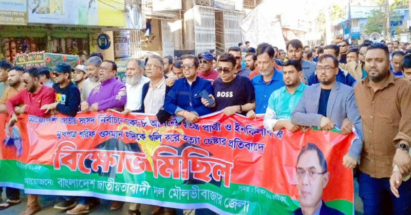 এদিকে জুলাই যোদ্ধা ও ইনকিলাব মঞ্চের মুখপাত্র ওসমান হাদী উপর এমন গুলিবর্ষণ জাতীয় নিরাপত্তা ও গণতান্ত্রিক চেতনার উপর সরাসরি আঘাত উল্লেখ করে এর সুষ্ঠ বিচারের দাবি জানিয়ে রাতে প্রেসক্লাব চত্বরে বিক্ষোভ মিছিল করেছে মৌলভীবাজারের বিপ্লবী ছাত্র জনতা ও এনসিপি। এসময় তাঁরা বলেন একের পর এক জুলাই যোদ্ধাদের উপর হামলা প্রমাণ করে এটি কেবল ব্যক্তি আক্রমণ নয়, বরং ন্যায়বিচার, স্বাধীনতা ও গণতান্ত্রিক মূল্যবোধকে স্তব্ধ করার গভীর ষড়যন্ত্র।