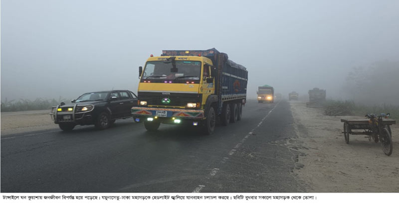 এদিন সকাল থেকে যমুনাসেতু-টাঙ্গাইল-ঢাকা মহাসড়কসহ বিভিন্ন আঞ্চলিক সড়কে যানবাহন চলাচলে বিঘœ ঘটছে। কুয়াশার তীব্রতায় দৃষ্টিসীমা কমে আসায় চালকরা হেডলাইট জ্বালিয়ে ধীরগতিতে যানবাহন চলাচল করতে বাধ্য হচ্ছেন। দূরপাল্লার বাস ও পণ্যবাহী ট্রাকগুলো নির্দিষ্ট গন্তব্যে পৌঁছাতে কয়েক ঘণ্টা দেরি করছে। মহাসড়কের ঝুঁকিপূর্ণ মোড়গুলোতে দুর্ঘটনা এড়াতে পুলিশি তৎপরতা বাড়ানো হয়েছে।
