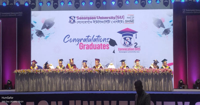 সোনারগাঁও ইউনিভার্সিটি তার দ্বিতীয় সমাবর্তন ২০২৫ আজ রোববার (২৮ ডিসেম্বর) রাজধানীর আন্তর্জাতিক কনভেনশন সিটি বসুন্ধরা (ICCB)-তে সফলভাবে অনুষ্ঠিত হয়েছে। অনুষ্ঠানের প্রধান অতিথি ও সভাপতিত্ব করেন অন্তর্বর্তী সরকারের শিশু বিষয়ক ও সমাজকল্যাণ মন্ত্রণালয়ের উপদেষ্টা শারমিন এস. মুরশিদ ও সমাবর্তন বক্তা হিসেবে উপস্থিত ছিলেন তথ্য ও সম্প্রচার, পরিবেশ, বন ও জলবায়ু পরিবর্তন মন্ত্রণালয়ের উপদেষ্টা সৈয়দা রিজওয়ানা হাসান। বিশেষ অতিথি হিসেবে উপস্থিত ছিলেন বাংলাদেশ অ্যাক্রেডিটেশন কাউন্সিলের চেয়ারম্যান প্রফেসর ড. মেসবাহুদ্দিন আহমেদ।