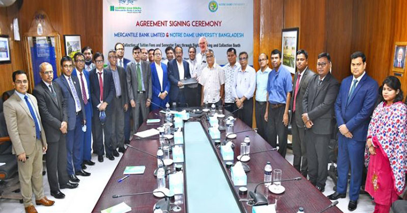 মার্কেন্টাইল ব্যাংক লিমিটেড এবং নটরডেম ইউনিভার্সিটি বাংলাদেশ-এর মধ্যে সোমবার একটি চুক্তি স্বাক্ষরিত হয়। এই চুক্তির মাধ্যমে মার্কেন্টাইল ব্যাংক লিমিটেড তার ডিজিটাল ব্যাংকিং সার্ভিস ‘এমবিএল রেইনবো’ এবং কালেকশন বুথের মাধ্যমে নটরডেম ইউনিভার্সিটির শিক্ষার্থীদের টিউশন ফি, অ্যাডমিশন ফি এবং অন্যান্য ফি সংগ্রহের দায়িত্ব পেল।