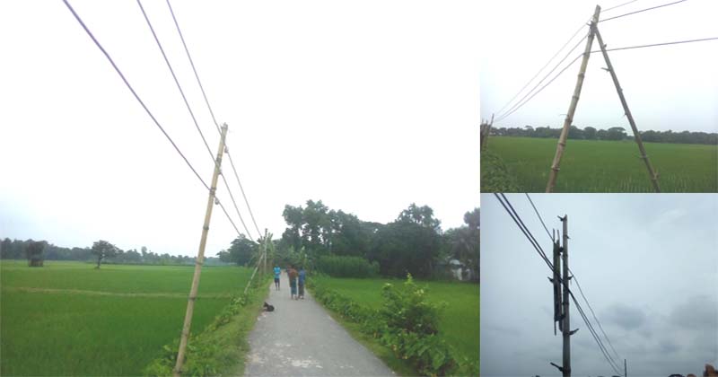 গ্রামের মাঝখান দিয়ে গেছে পীচঢালা পথ। সেই পথের পাশেই বাঁশের খুঁটিতে ঝুলছে বিদ্যুৎ সঞ্চালন লাইন। বৈদুতিক তারের ভারে বাঁশের খুঁটি হেলে পড়েছে। কোথাও আবার হেলে থাকা বাঁশের খুঁটি ঠেকনা দেয়া হয়েছে অপর একটি বাঁশ দিয়ে। আবার কোথাও কোথাও বাঁশের খুঁটি নিচের দিকে ভেঙ্গে তারের সাথে ঝুলে আছে।