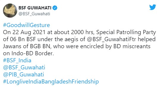 মঙ্গলবার ভরতীয় সীমান্তরক্ষী বাহিনী বিএসএফের গুয়াহাটি শাখার এক টুইট বার্তায় বিজিবি সদস্যদের উদ্ধারের এই তথ্য জানানো হয়েছে।