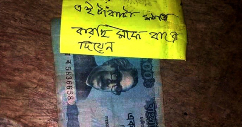 রাত তখন ৯টা। হঠাৎ কানে এলো মানুষের পায়ের শব্দ। দরজা খুলে বের হতেই দেখেন কেউ একজন দ্রুতগতিতে বাড়ি ছাড়ছেন। পিছুও নেন। কিন্তু দেখা আর পাননি। ফিরে আসার পর চোখ কপালে ওঠার মতো হয়। ঘরের দরজা বন্ধ করতে গিয়ে দেখেন পড়ে আছে ১০০ টাকার নোট। টাকার সঙ্গে রয়েছে একটি চিরকুট।