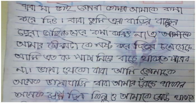 মৃত্যুর আগে এক সুইসাইড নোটে ওই শিক্ষার্থী লিখেন ‘বাবা মা ভাই বোনরা তোমরা আমাকে কমা করে দিও। বাবা তুমি এরা বাড়ির বাচ্চুর ছেরা জহিরুলেরে কমা করিও না। এ আমার জীবনটাকে নষ্ট করে দিয়ে চলে গেছে। আমি এত বড় পাপ নিয়ে বাচে থাকতে পারব না। ভালো থেকো বাবা আমি তোমাকে অনেক ভালোবাসি, বাবা আমার বেঁচে থাকার অনেক স্বপ্ন ছিল কিন্তু ও আমাকে বেঁচে থাকতে দিল না।’