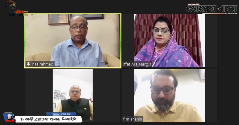 দৈনিক ভোরের পাতার নিয়মিত আয়োজন ভোরের পাতা সংলাপের ৪৯৭তম পর্বে মঙ্গলবার (১৯ অক্টোবর) এসব কথা বলেন আলোচকরা। ভোরের পাতা সম্পাদক ও প্রকাশক ড. কাজী এরতেজা হাসানের নির্দেশনা ও পরিকল্পনায় অনুষ্ঠানে আলোচক হিসেবে উপস্থিত ছিলেন- সংগীত শিল্পী অধ্যাপক ইফফাত আরা নার্গিস, জার্মান আওয়ামী লীগের সিনিয়র নেতা, বাংলাদেশ কালচারাল অ্যাসোসিয়েশনের সভাপতি এবং লেখক মায়েদুল ইসলাম তালুকদার বাবুল, গৌরব ৭১-এর সাধারণ সম্পাদক এফ এম শাহীন। অনুষ্ঠানটি সঞ্চালনা করেন সাবেক তথ্য সচিব নাসির উদ্দিন আহমেদ।