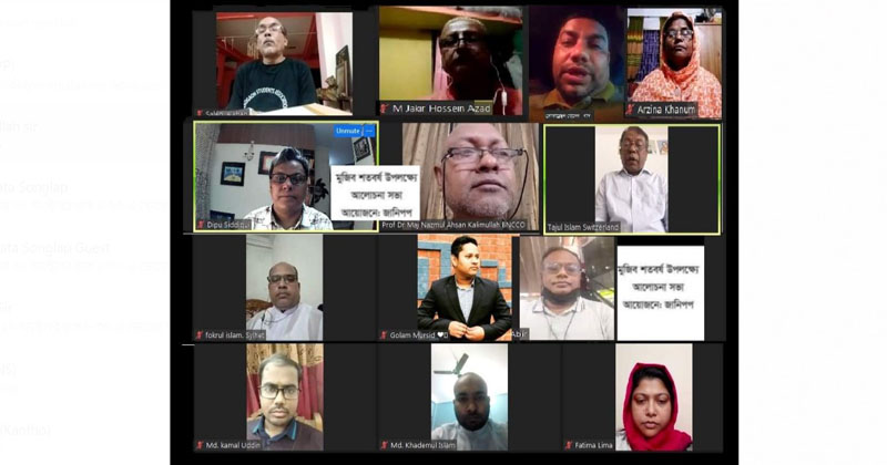 মুজিব শতবর্ষ উপলক্ষ্যে আজ বুধবার (২০ অক্টোবর) জুমে অনুষ্ঠিত আলোচনা সভায় জানিপপ-এর প্রতিষ্ঠাতা চেয়ারম্যান প্রফেসর ডক্টর মেজর নাজমুল আহসান কলিমউল্লাহ, বিএনসিসিও অনুষ্ঠানের সভাপতি হিসেবে সংযুক্ত ছিলেন। সভাপতির বক্তব্যে প্রফেসর ডক্টর নাজমুল আহসান কলিমউল্লাহ বলেন, বঙ্গবন্ধু গণমানুষের ভাষা অনুধাবন করতে পারতেন।