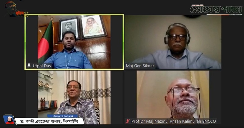 দৈনিক ভোরের পাতার নিয়মিত আয়োজন ভোরের পাতা সংলাপের ৫১২তম পর্বে বুধবার (৩ নভেম্বর) এসব কথা বলেন আলোচকরা। ভোরের পাতা সম্পাদক ও প্রকাশক ড. কাজী এরতেজা হাসানের নির্দেশনা ও পরিকল্পনায় অনুষ্ঠানে আলোচক হিসেবে উপস্থিত ছিলেন- পিএসসি, নিরাপত্তা বিশ্লেষক গবেষক ও লেখক মে. জে. (অব.) এ কে মোহাম্মদ আলী শিকদার, নিরাপত্তা বিশ্লেষক ও সামরিক গবেষক মে. জে. (অব.) আব্দুর রশিদ, ঢাকা বিশ্ববিদ্যালয়ের লোক প্রশাসন বিভাগের অধ্যাপক, জাতীয় নির্বাচন পর্যবেক্ষণ পরিষদের (জানিপপ) চেয়ারম্যান ড. নাজমুল আহসান কলিমউল্লাহ। অনুষ্ঠানটি সঞ্চালনা করেন ভোরের পাতার বিশেষ প্রতিনিধি উৎপল দাস।