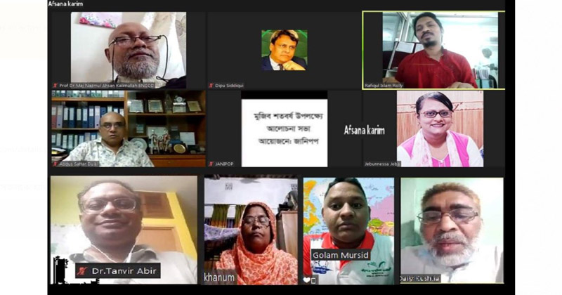 মুজিব শতবর্ষ উপলক্ষ্যে আজ শুক্রবার (০৫ নভেম্বর) জুমে অনুষ্ঠিত আলোচনা সভায় জানিপপ-এর প্রতিষ্ঠাতা চেয়ারম্যান প্রফেসর ডক্টর মেজর নাজমুল আহসান কলিমউল্লাহ, বিএনসিসিও অনুষ্ঠানের সভাপতি হিসেবে সংযুক্ত ছিলেন। সভাপতির বক্তব্যে প্রফেসর ডক্টর নাজমুল আহসান কলিমউল্লাহ বলেন, বঙ্গবন্ধু পাঠের শুরু আছে, শেষ নেই।