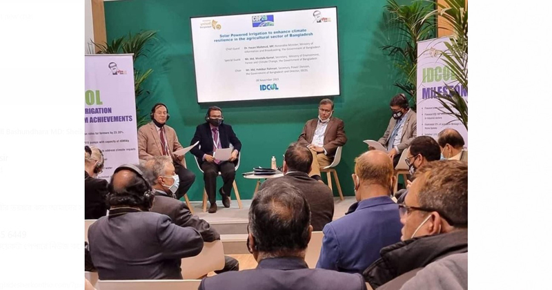 সরকারের অবকাঠামোগত উন্নয়ন প্রতিষ্ঠান ইনফ্রাস্ট্রাকচার ডিভালপমেন্ট কোম্পানি লিমিটেড-ইডকল আয়োজিত 'বাংলাদেশের কৃষিতে জলবায়ু ঝুঁকি মোকাবিলায় সক্ষমতা বৃদ্ধিতে সৌরচালিত সেচযন্ত্র ব্যবহার বিষয়ে সংলাপ' (ডায়ালগ অন প্রসপেক্ট অব সোলার পাওয়ার্ড ইরিগেশন টু এনহ্যান্স ক্লাইমেট রেজিলিয়েন্স ইন দ্য এগ্রিকালচার সেক্টর অব বাংলাদেশ) সংলাপে মন্ত্রী দেশের কৃষিতে সোলার প্যানেলের ব্যবহারবৃদ্ধিতে সহায়তায় বিশ্বব্যাংক ও উন্নয়ন সহযোগী সংস্থাগুলোর প্রতি আহ্বান জানান।