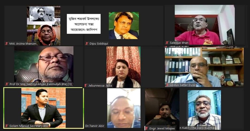 মুজিব শতবর্ষ উপলক্ষ্যে আজ রবিবার (১৪ নভেম্বর) জুমে অনুষ্ঠিত আলোচনা সভায় জানিপপ-এর প্রতিষ্ঠাতা চেয়ারম্যান প্রফেসর ডক্টর মেজর নাজমুল আহসান কলিমউল্লাহ, বিএনসিসিও অনুষ্ঠানের সভাপতি হিসেবে সংযুক্ত ছিলেন। সভাপতির বক্তব্যে প্রফেসর ডক্টর নাজমুল আহসান কলিমউল্লাহ বলেন,