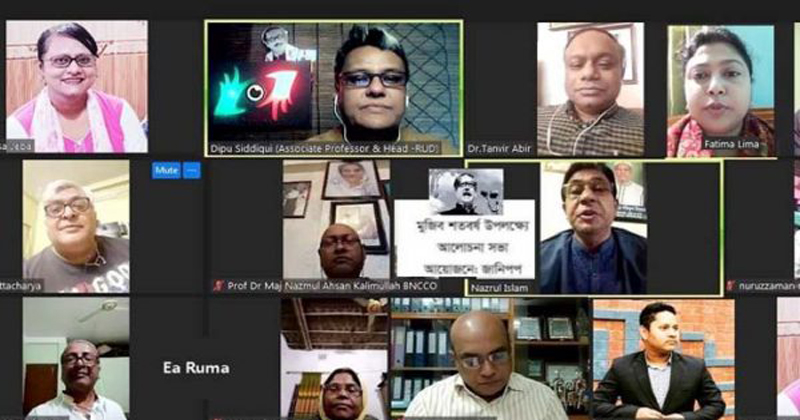 মুজিব শতবর্ষ উপলক্ষ্যে শনিবার (২০ নভেম্বর) জুমে অনুষ্ঠিত আলোচনা সভায় জানিপপ-এর প্রতিষ্ঠাতা চেয়ারম্যান প্রফেসর ডক্টর মেজর নাজমুল আহসান কলিমউল্লাহ, বিএনসিসিও অনুষ্ঠানের সভাপতি হিসেবে সংযুক্ত ছিলেন।