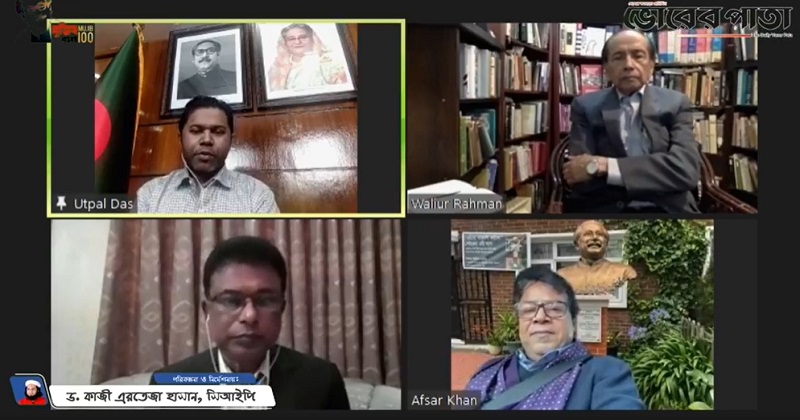 দৈনিক ভোরের পাতার নিয়মিত আয়োজন ভোরের পাতা সংলাপের ৫৩৪তম পর্বে বৃহস্পতিবার (২৫ নভেম্বর) এসব কথা বলেন আলোচকরা। ভোরের পাতা সম্পাদক ও প্রকাশক ড. কাজী এরতেজা হাসানের নির্দেশনা ও পরিকল্পনায় অনুষ্ঠানে আলোচক হিসেবে উপস্থিত ছিলেন- সাবেক পররাষ্ট্র সচিব, বাংলাদেশ হেরিটেজ ফাউন্ডেশনের প্রতিষ্ঠাতা প্রেসিডেন্ট ড. ওয়ালি-উর রহমান, স্বাধীনতা চিকিৎসক পরিষদের (স্বাচিপ) মহাসচিব অধ্যাপক ডা. মোহাম্মদ আবদুল আজিজ, লন্ডন আওয়ামী লীগের যুগ্ম সম্পাদক, বহির্বিশ্বে বঙ্গবন্ধুর ভাস্কর্য প্রতিষ্ঠাতা আফছার খান সাদেক। অনুষ্ঠানটি সঞ্চালনা করেন ভোরের পাতার বিশেষ প্রতিনিধি উৎপল দাস।
