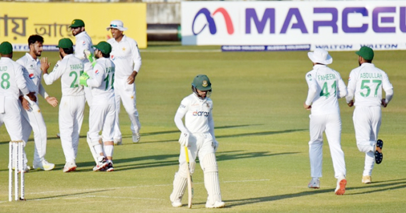 ফলে ৫৬.২ ওভারে ১৫৭ রানে অলআউট বাংলাদেশ। অর্থাৎ জয় পেতে ২০২ রান করতে হবে পাকিস্তানকে।