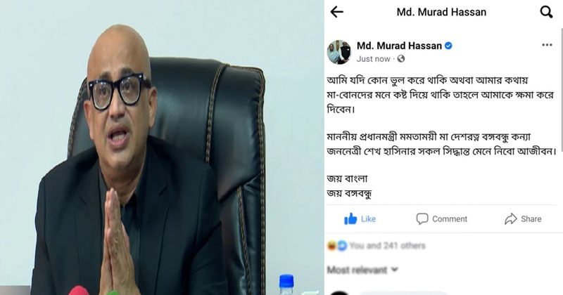 ফেসবুক স্ট্যাটাসে ডা. মুরাদ লেখেন, ‘আমি যদি কোনো ভুল করে থাকি অথবা আমার কথায় মা-বোনদের মনে কষ্ট দিয়ে থাকি তাহলে আমাকে ক্ষমা করে দিবেন। মাননীয় প্রধানমন্ত্রী মমতাময়ী মা দেশরত্ন বঙ্গবন্ধু কন্যা জননেত্রী শেখ হাসিনার সকল সিদ্ধান্ত মেনে নিবো আজীবন। জয় বাংলা,জয় বঙ্গবন্ধু।’