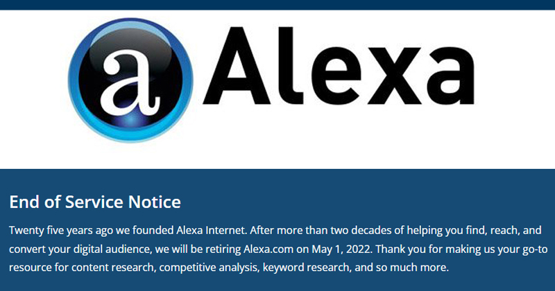 আন্তর্জাতিক ওয়েব ট্রাফিক তথ্য সরবরাহকারী ওয়েবসাইট অ্যালেক্সা ডটকম বন্ধ হয়ে যাচ্ছে। ২০২২ সালের ১ মে থেকে এটি আর কার্যকর থাকবে না।